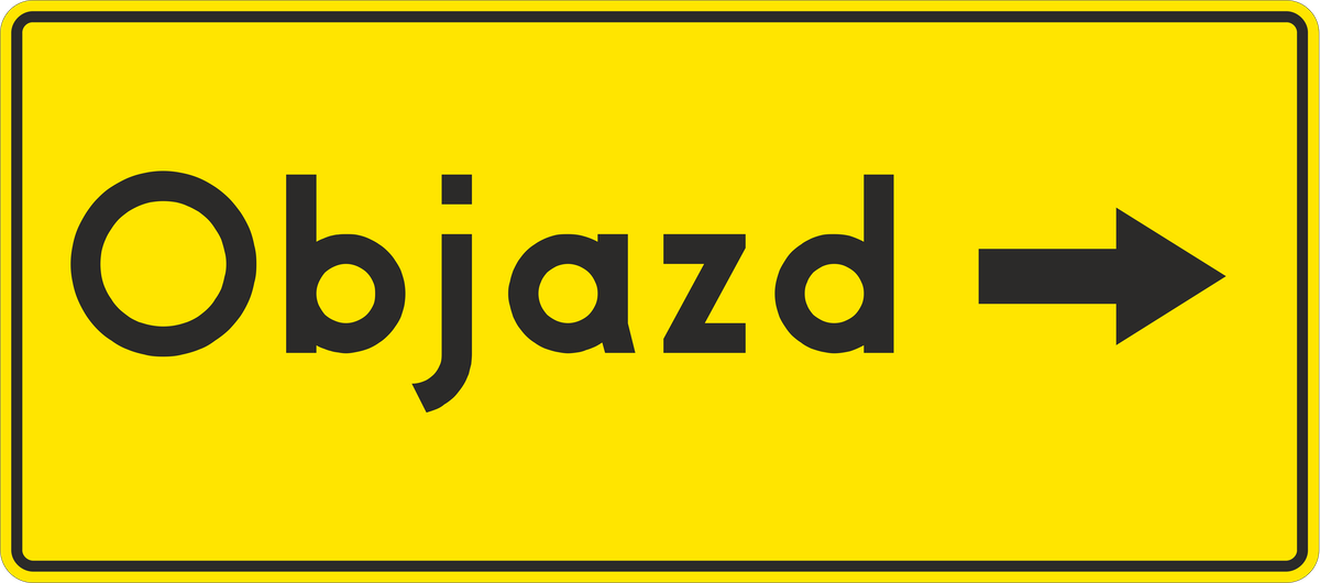 Znak drogowy F-9 "kierunek ruchu objazdu wskazany na znaku", wskazuje kierunek ruchu pojazdów na wyznaczonym objeździe. W tym przypadku jest to "objazd prawo".