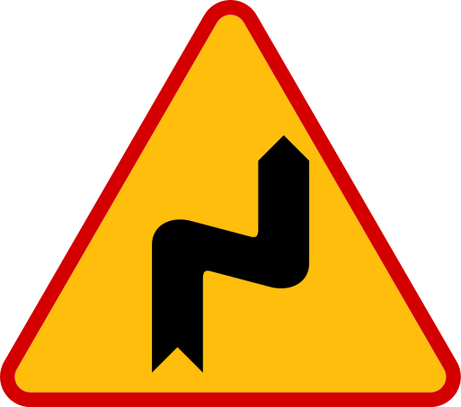 Znak ostrzega przed niebezpiecznymi zakrętami, z których pierwszy jest w prawo.
